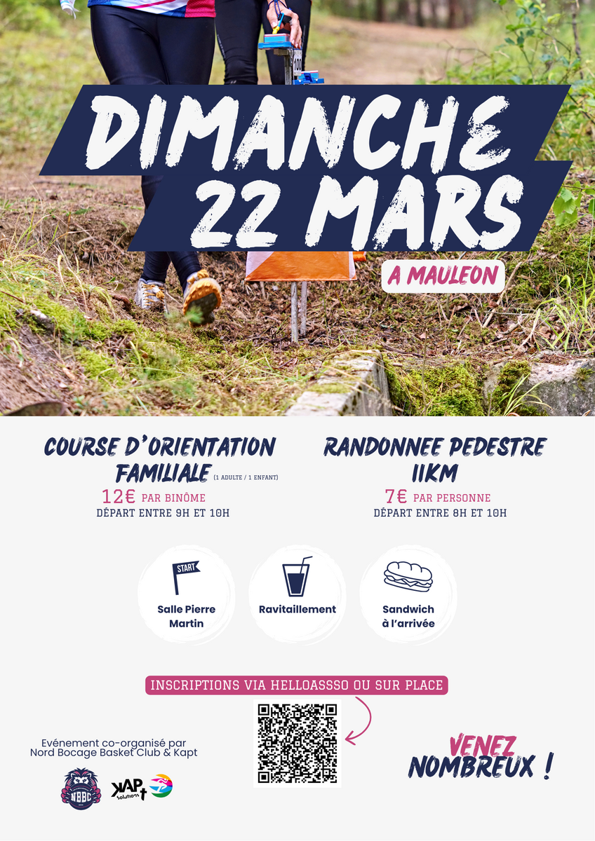 ➡️ Informations et inscriptions sur HelloAsso via ce lien : https://www.helloasso.com/associations/nord-bocage-basketball-club/evenements/course-d-orientation-familiale-et-randonnee-pedestre
